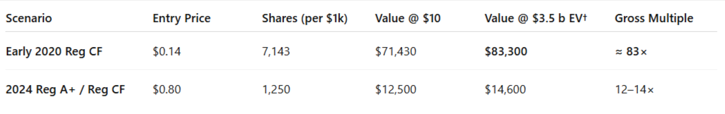 EV basis: $3.5 b ÷ $42 m entry = ≈ 83× paper lift for 2020 investors.