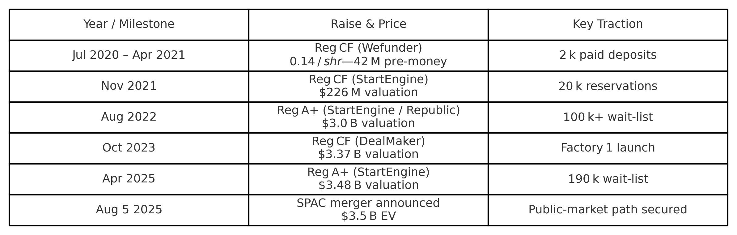 †EV method scales original $42 m valuation to $3.5B; actual share price post-SPAC will vary with redemptions, dilution, and market sentiment.